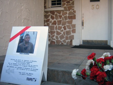 Une photographie d’Issa Diarra et des fleurs ont été déposées devant l’ambassade malienne. Ce geste s’inscrivait dans le cadre d’une campagne menée à l’échelle de la planète par le Réseau international No Vox dont le FRAPRU est membre. La veille, à la demande de l’Ambassade du Mali à Ottawa, l’ambassadeur a rencontré une délégation du FRAPRU qui lui a transmis de vive voix les revendications portées par le Réseau.