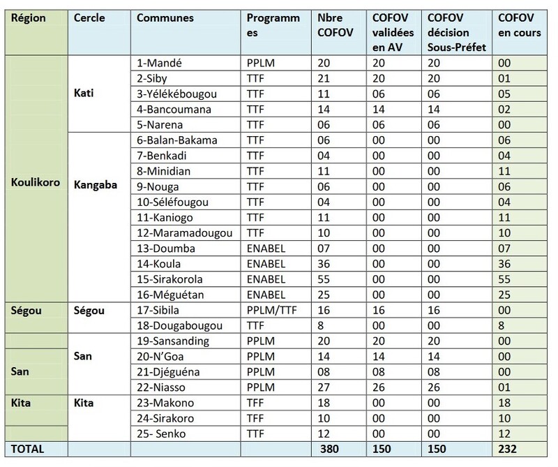 place des COFOV), ont fait l’objet d’échanges et d’analyses afin d’en trouver des solutions, dans les communes de Narena , Séléfougou, Kaniogo(cercle de Kangaba) Yélékébougou, Mandé, (cercle de Kati), Sirakoro,(cercle de Sirakoro), Sana (cercle de Ségou). Les difficultés rencontrées dans le processus relèvent d’une mauvaise interprétation de la sécurisation foncière, car à ne pas en douter les communautés ont des ressortissants dans les grandes villes notamment Bamako, qui influencent leur village pour des intérêts personnels, le plus souvent ils sont des spéculateurs fonciers.